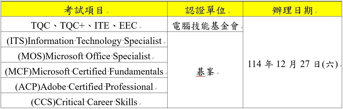 【技能檢定中心】114學年度第1學期電腦大會考(ITS、MOS、MCF、ACP、CCS),歡迎同學踴躍報名參加!(報名日期:10/27-11/28)(10/27公告)