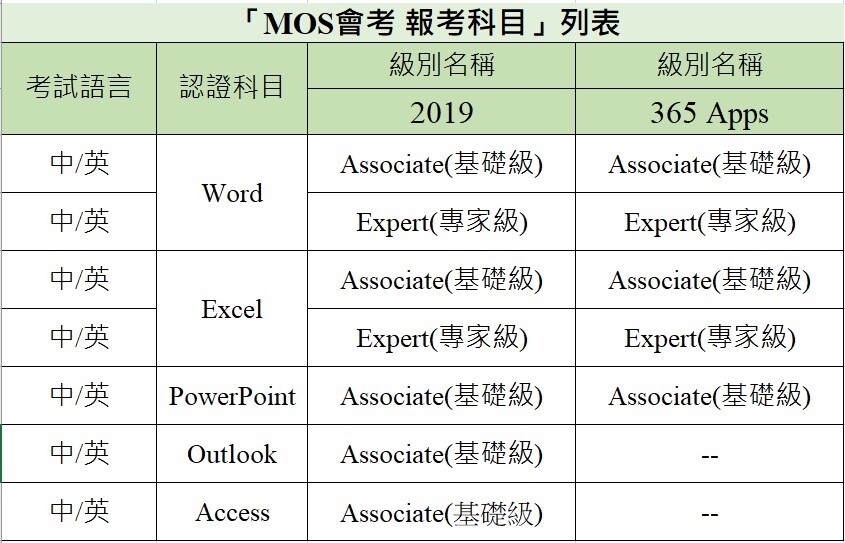 ※自2022年6月開始,Microsoft Technology Associate(簡稱MTA)停止辦理考試並全面改版為Information Technology Specialist(簡稱ITS)。