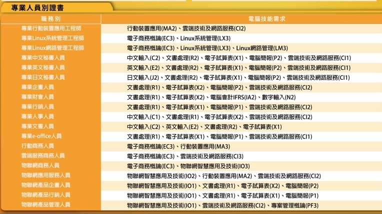 (2)TQC系列:電子商務概論(V4專業級)(V4實用級)(V4進階級)、電腦會計IFRS(V2專業級)(V2進階級)、物聯網智慧應用及技術(V2專業級)、資訊科技(專業級)、初級會計IFRS(V2實用級)、生成式AI應用與技術(生成式AI應用與技術實用級)