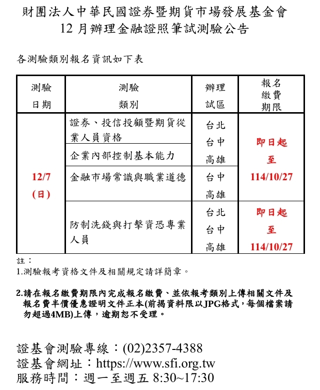 中華民國證券暨期貨市場發展基金會114年12月7日舉辦「證券、投信投顧暨 期貨從業人員資格測驗」、「企業內部控制基本能力測 驗」、「金融市場常識與職業道德測驗」(臺中及高雄試 區)及「防制洗錢與打擊資恐專業人員測驗」,提醒10/27報名截止,歡迎同學報考!