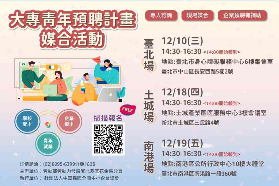 【職發處】勞動部北分署「114年度大專青年預聘計畫媒合活動」,歡迎教師報名參加!