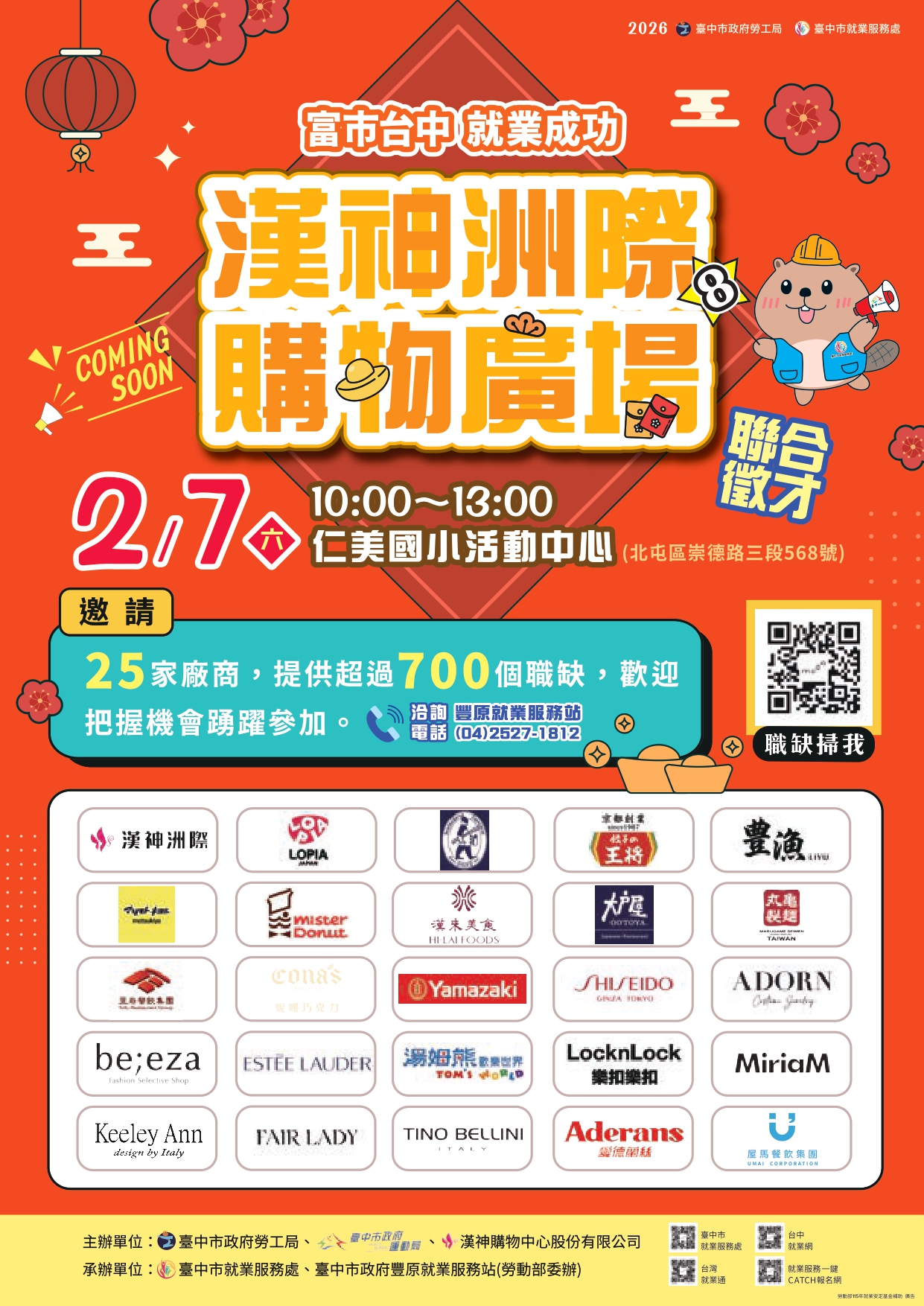 臺中市政府2月7日(星期六)在仁美國小辦理漢神洲際徵才,邀請25家漢神進駐廠商提供逾700個職缺,歡迎踴躍參加,詳情請至